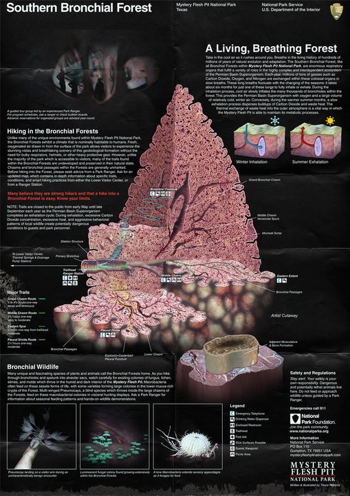 Vous l’avez deviné, le Mystery Flesh Pit National Park est une autre creepy pasta imaginé sur Internet et soutenue par une communauté de passionnée. Mais à la différence des fictions collectives comme les Backrooms ou la fondation SCP (une sorte d’organisation secrète qui enferme des monstres pour protéger l’humanité), la Mystérieuse Fosse de Chair est l’invention d’un seul auteur bien identifié. Il s’agit de Trevor Robert, un artiste et illustrateur spécialisés en world building. C’est d’ailleurs sur le subreddit consacré à cette activité qui consiste à imaginer des mondes de fictions, qu’il a posté il y a trois ans ce concept incroyable. devant le succès rencontré, Trevor a continué à développer cet univers via un site dédié lui permettant de construire une identité visuelle, mais aussi une histoire que les internautes peuvent découvrir à travers une série de rapports d’expertises et de documents. Commencé comme un petit projet pour le fun, notre artiste compte à présent sur le soutien des internautes à travers son compte Patreon pour faire du Mystery Flesh Pit National Park un livre illustré.